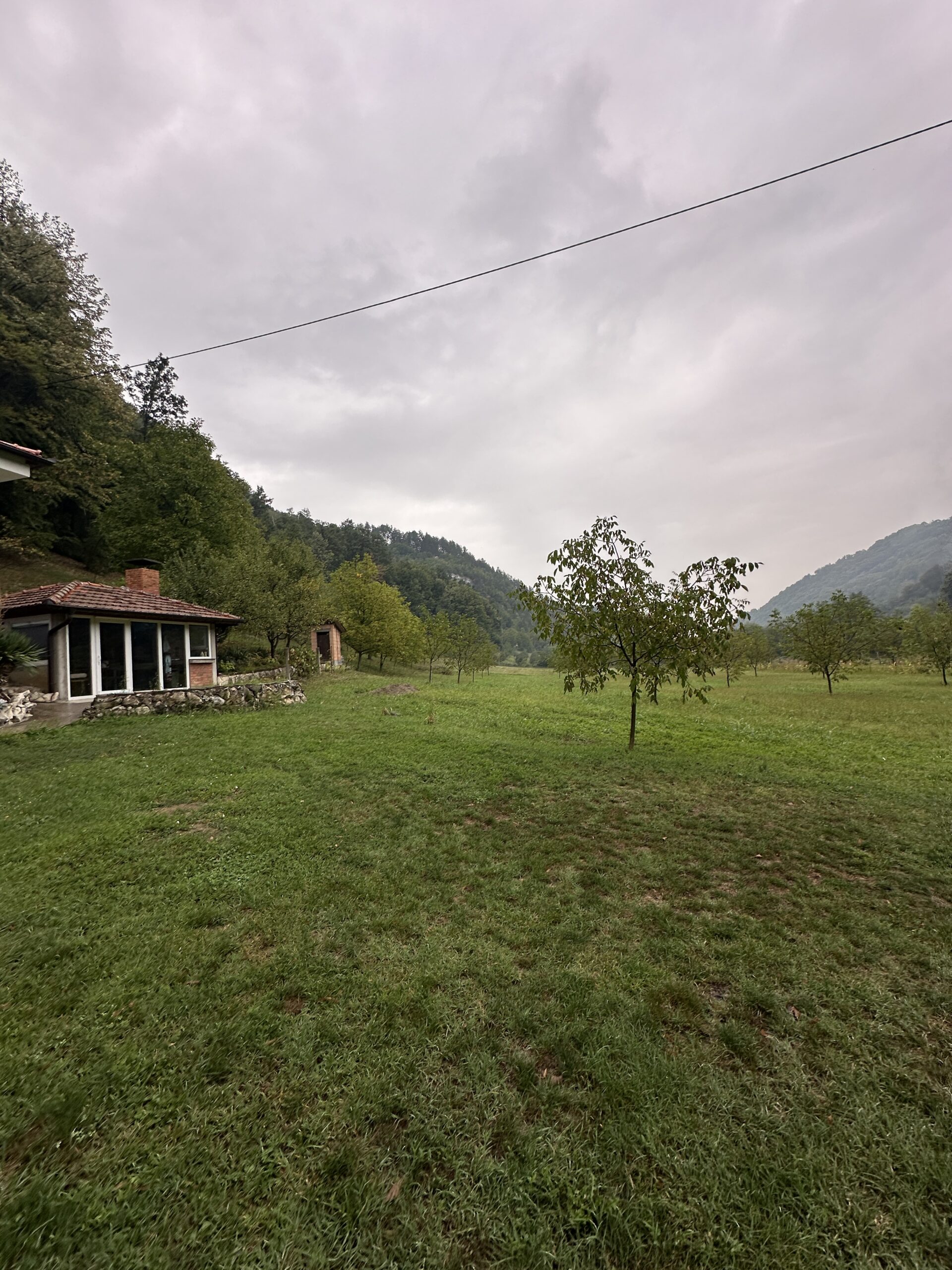 Accommodation: Two spacious rooms (living and bedroom), kitchen, and bathroom. Outdoor terrace with grill area, large meadow, and orchard.